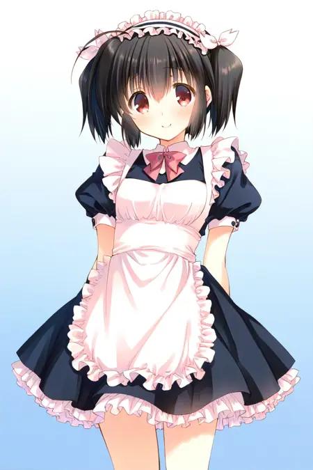 yuzuhara konomi,red eyes,twintails,black hair,short hair,bow,flat chest,