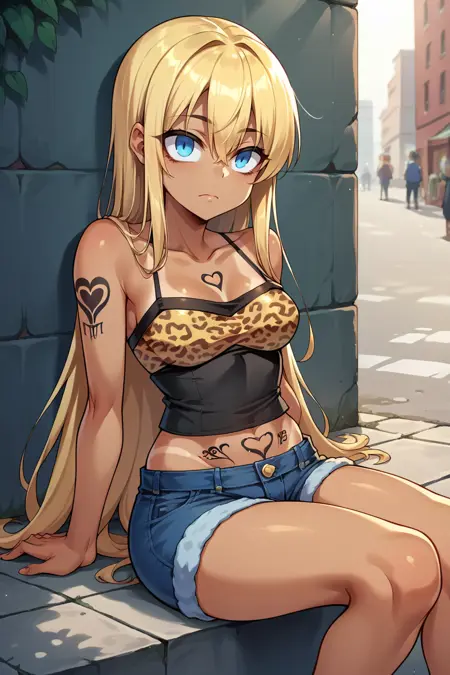 「変身」後の外観には「altSaki, blue eyes, blonde hair, long hair, tan, leopard print, black camisole, midriff, denim shorts, tattoo, black thighhighs」を追加してください。