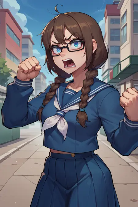 添加 "defSaki, 蓝眼睛, 棕色头发, 双马尾, 发丝垂至肩部, 眼镜, 深蓝色衬衫, 服装配饰, 白色领巾, 长袖, 深蓝色裙子, 百褶裙" 以呈现她最初的造型。
