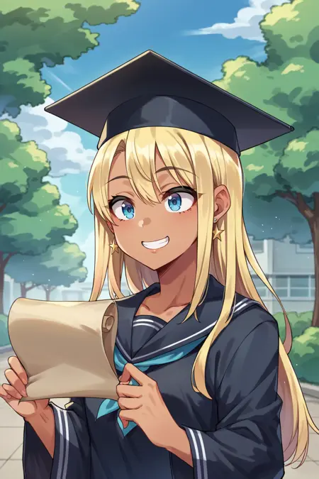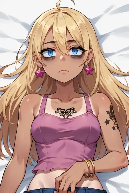 別の変身後の外観には「altSaki, blue eyes, blonde hair, long hair, star earrings, tan, pink tank top, midriff, denim shorts, bracelet」を追加してください。