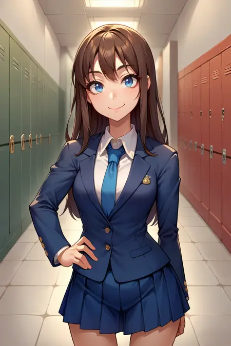 添加 "defSaki, 蓝眼睛, 棕色头发, 长发, 蓝色西装外套, 蓝色领带, 百褶裙" 以呈现她改造后的造型。