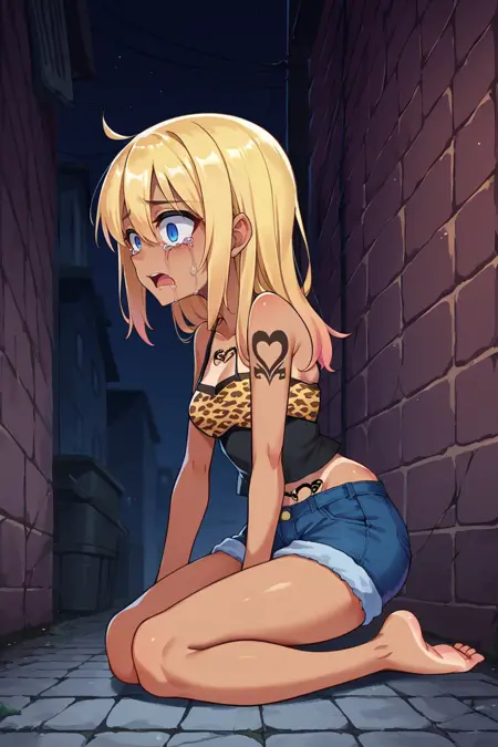 添加 "altSaki, 蓝眼睛, 金发, 长发, 肤色古铜, 豹纹, 黑色吊带背心, 露腹, 牛仔短裤, 纹身, 黑色过膝袜" 以呈现她“蜕变”后的造型。