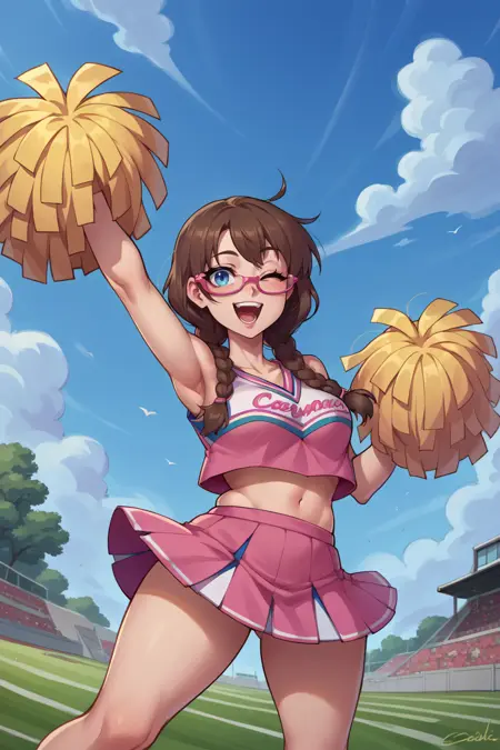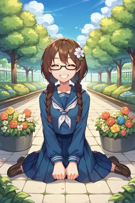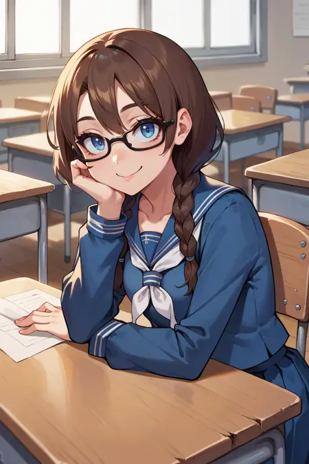 初期外観には「defSaki, blue eyes, brown hair, twin braids, hair over shoulders, glasses, navy blue shirt, serafuku, white neckkerchief, long sleeves, navy blue skirt, pleated skirt」を追加してください。