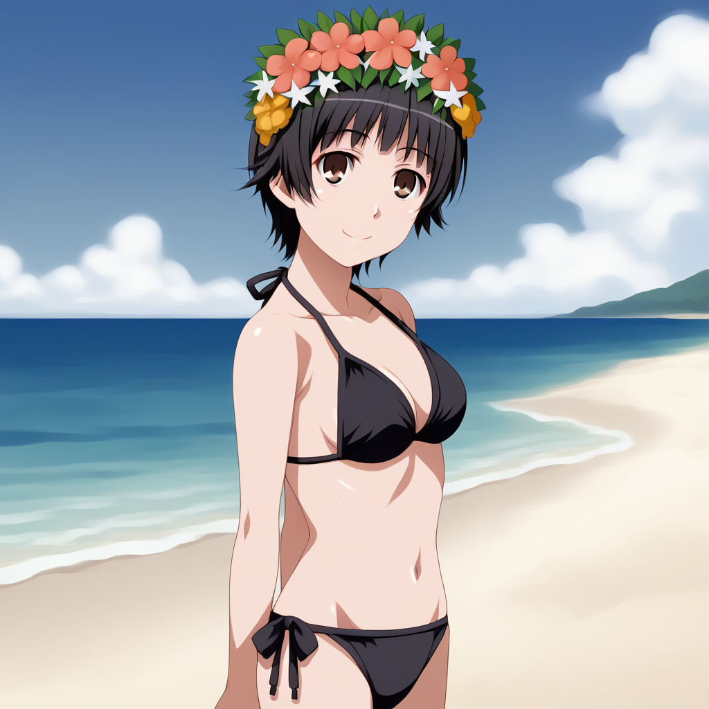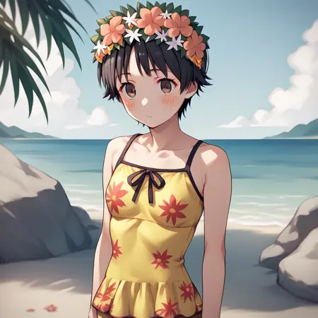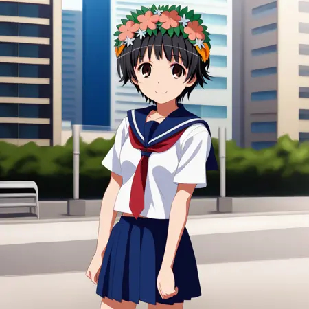 彼女は特定の衣装に訓練されているわけではありませんが、データセットには頻繁に現れる主に二つの衣装があります。彼女の花の髪飾りは、公式画像でも大きく変化するため、生成結果に安定して現れるかどうかは運次第です。花を除くと、生成がより良くなる可能性がありますが、そうすると彼女はただの普通の少女になり、頭に花をつけるというデザインのユーモアが失われてしまいます。