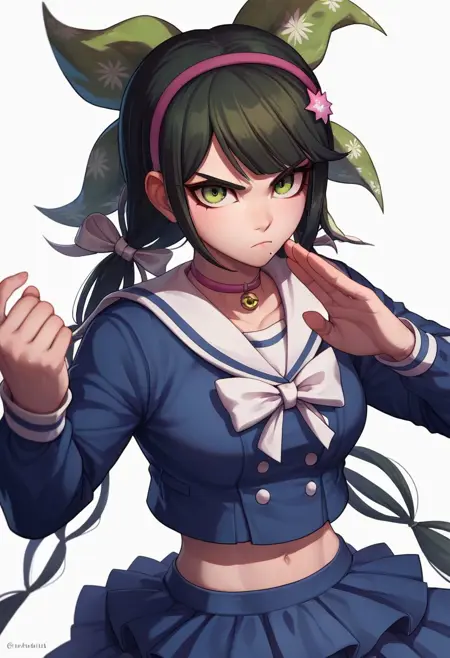 Tenko Chabashira, Mole under mouth, Dark green hair, green eyes, twintails, hair ribbons, hairband, choker, school uniform, midriff, layered skirt, socks, sandals