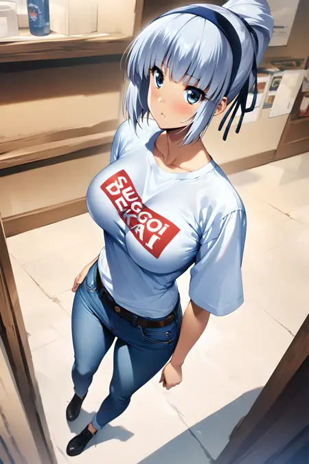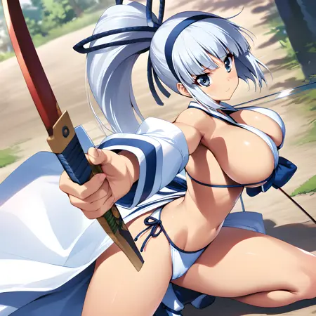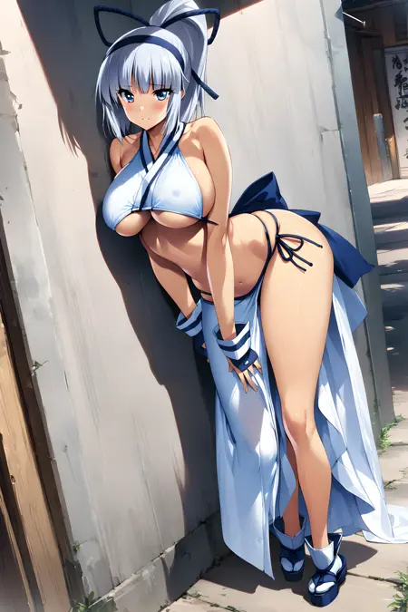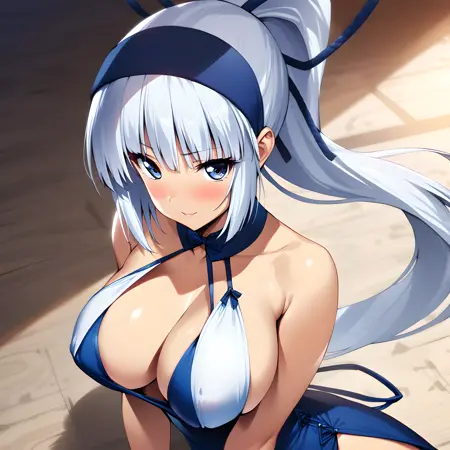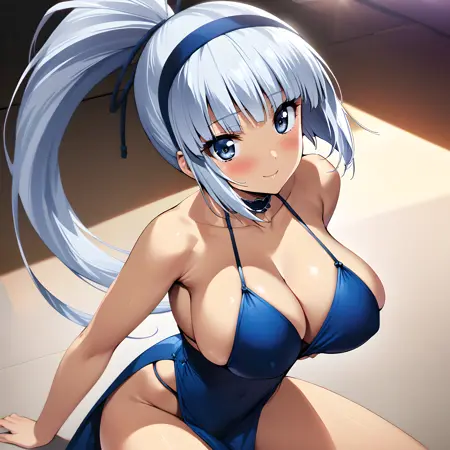 Activate using "mina majikina" tag, followed by "silver hair, blue eyes, ponytail, large breasts,"