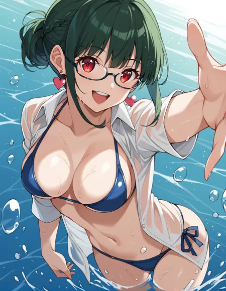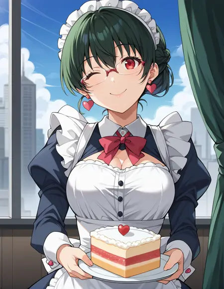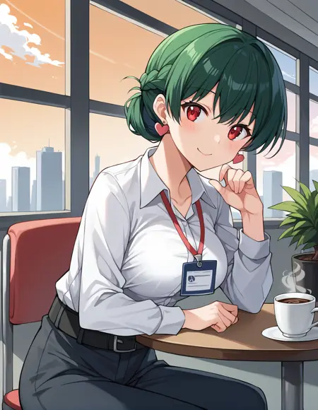 トリガー語:anosillus_ii, 1girl, 赤い目, 三白眼, 濃い緑色の髪, 短い髪, 下で結んだ髪, フレンチブレイド, 前髪