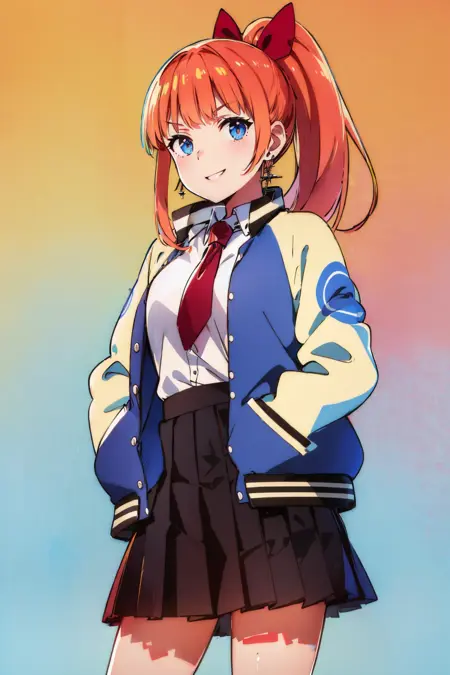 京子的触发词 + 服装: kyoko (rcg), letterman夹克, 白色衬衫, 红色领结, 百褶裙, 过膝袜, 蓝色运动鞋