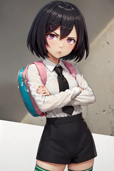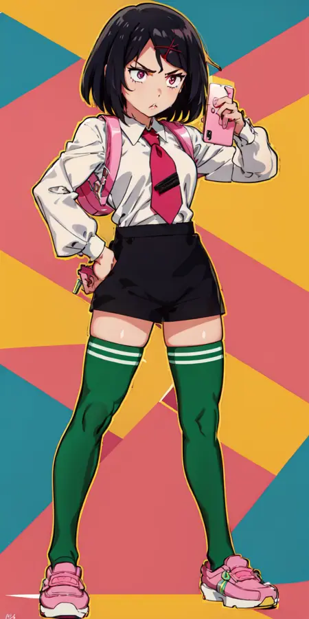 美佐子的触发词 + 服装: misako (rcg), 白色衬衫, 衬衫扎进裤子里, 红色领结, 长袖, 黑色短裤, 绿色长筒袜, 粉色鞋履, 粉色背包