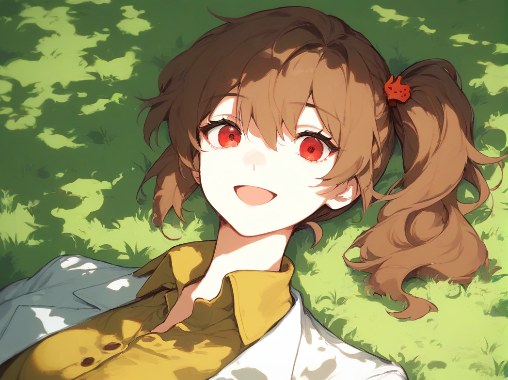 red eyes, brown hair, long hair, ponytail