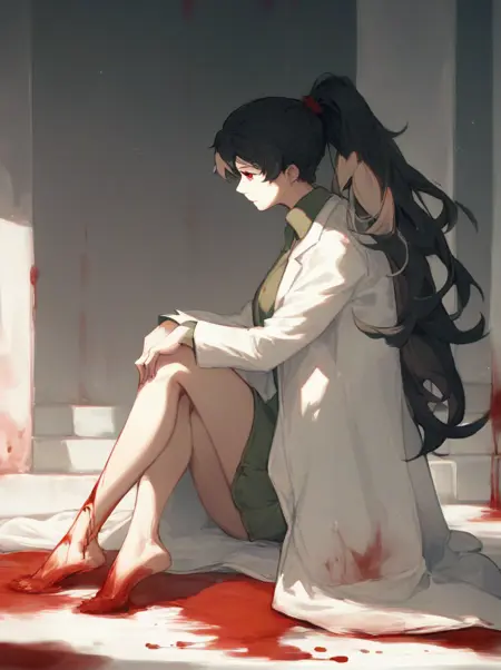 black skirt, green shirt, labcoat,