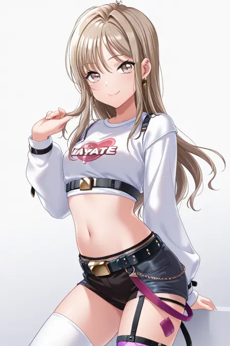 hayate, 1girl, solo, long hair, looking at viewer, breasts, upper body, navel, v, bangs, long sleeves, crop top, jacket, brown eyes, shoulder cutout, clothing cutout, stage outfit, stage