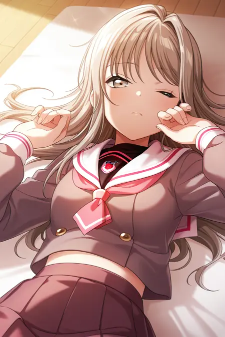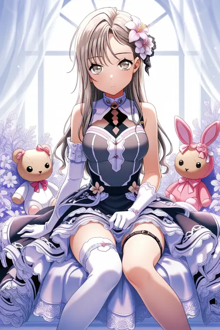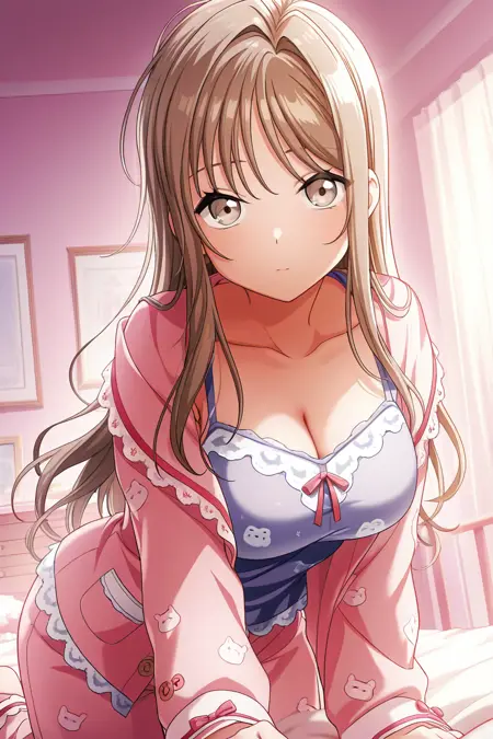 hayate, 1girl, solo, long hair, looking at viewer, breasts, upper body, navel, v, bangs, long sleeves, crop top, jacket, brown eyes, shoulder cutout, clothing cutout, stage outfit, stage