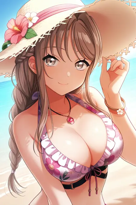 hayate, 1girl, swimsuit, hat, bikini, braid, breasts, jewelry, flower, solo, bracelet, straw hat, smile, earrings, looking at viewer, twin braids, brown hair, cleavage, ubuw