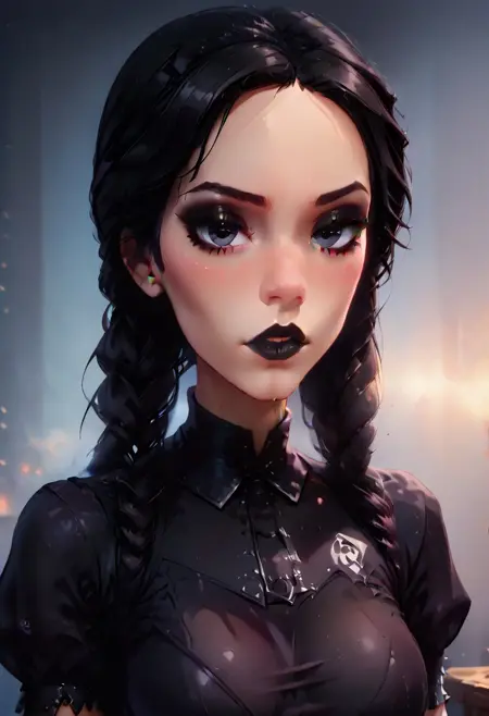 Prompt activator : 1girl, Wednesday addams \(The addams family\),(ultra HD quality details), hair in two ponytails, black hair, raven black eyes, beautiful face, pale skin, beautiful face,