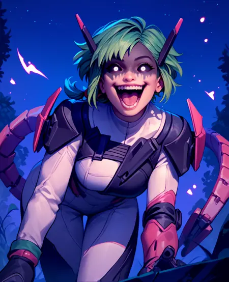 alterxl, white eyes, black sclera, - green hair, or aqua hair, - short hair, or low ponytail, - dark lips, or lipstick,