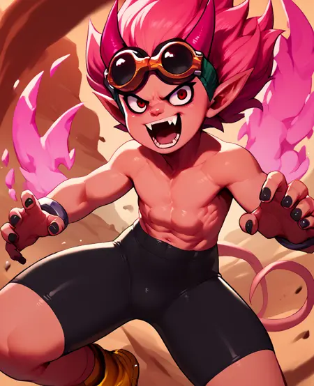 beelzebubxl, pink hair, black eyes, pink horns,
