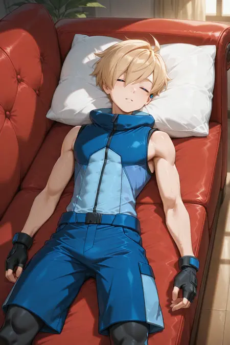 - ace_sm, blonde hair, blue eyes, hair over one eye, earpiece, blue sleeveless jacket, blue shorts, black leggings, black fingerless gloves, blue sneakers,