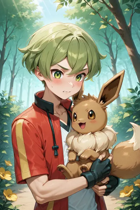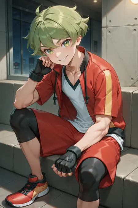 - ace_oras, green hair, green eyes, red open jacket, white shirt, red shorts, red shoes, leggings, black fingerless gloves, leggings