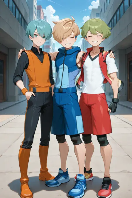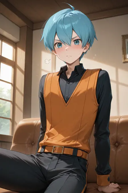- ace_bw, blue hair, blue eyes, black shirt, black pants, orange vest, orange boots,