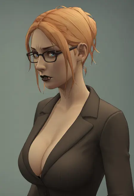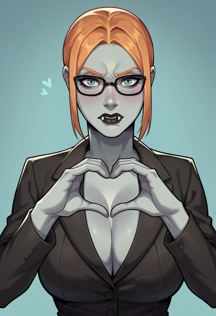 score_9, score_8_up, score_7_up, score_6_up, score_5_up, score_4_up, 1girl,lora:TheresaVoerman:0.8 solo, formal, glasses, breasts, large breasts, cleavage, suit, black-framed eyewear, looking at viewer, pencil skirt, orange hair, blue eyes, black lips, side view, small fangs, looking at viewer, embarrassed, upper body,