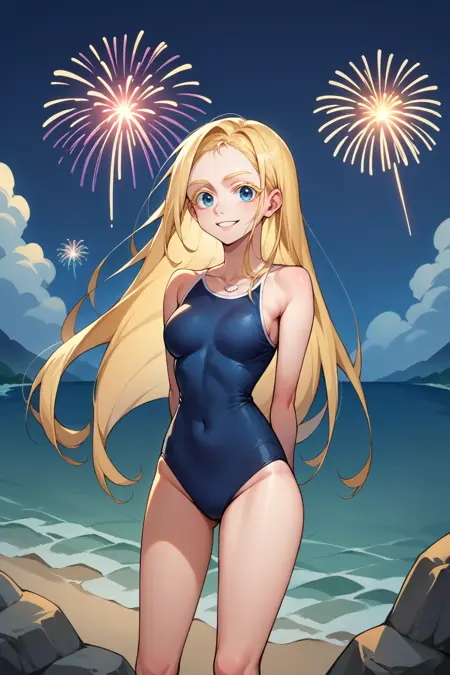 衣装:シェルネックレス、ワンピース水着