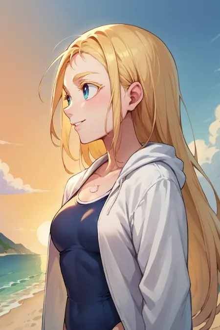 복장: 셸 목걸이, 원피스 수영복