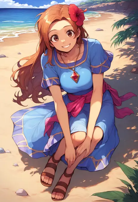 衣装タグ:「シングルヘアフローラー、ネックレス、青いドレス、帯、ブレスレット、サンダル」