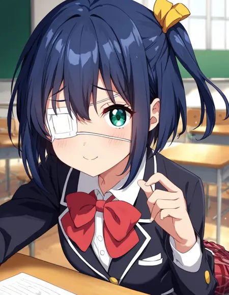 1girl, takanashi rikka, short hair, one side up, black hair, green eyes, yellow hair ribbon, school uniform, black blazer, red bowtie, red skirt, plaid skirt, pleated skirt