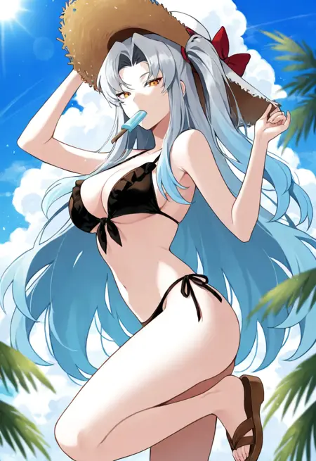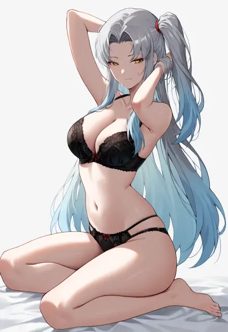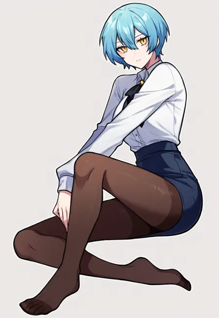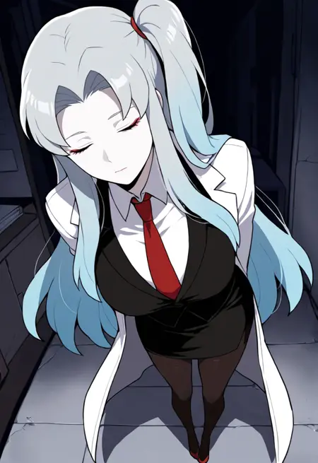 安吉拉PM,LC,长发,蓝发,侧马尾,黄眼,红色领带,黑色铅笔裙,白大褂,黑色背心,白衬衫,黑色丝袜,红鞋