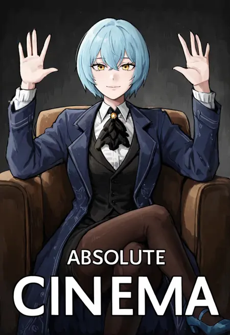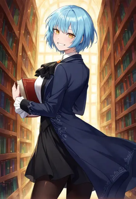 安吉拉PM,LOR,短发,蓝发,黄眼,白衬衫,黑色背心,黑色领结,黑色短裙,黑色丝袜,蓝鞋,深蓝色外套,敞开式外套