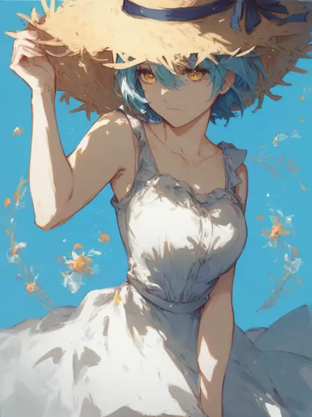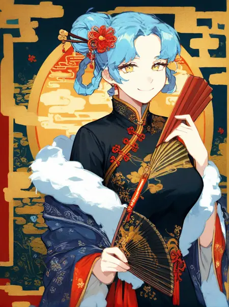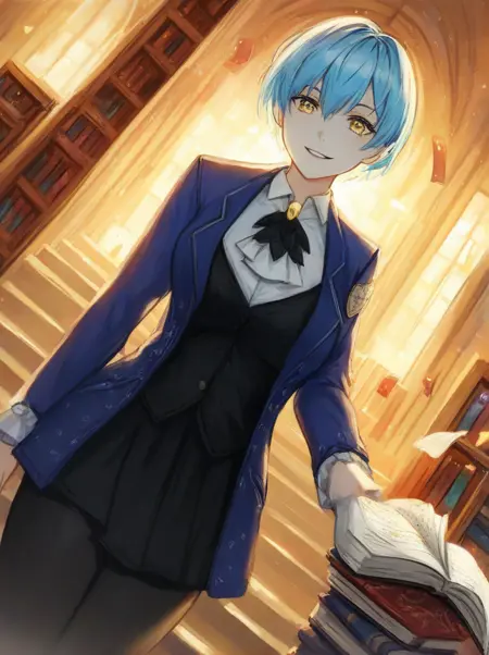 AngelaPM, LOR, short hair, blue hair, yellow eyes, white shirt, black vest, black ascot, black skirt, black pantyhose, blue shoes, dark blue coat, open coat