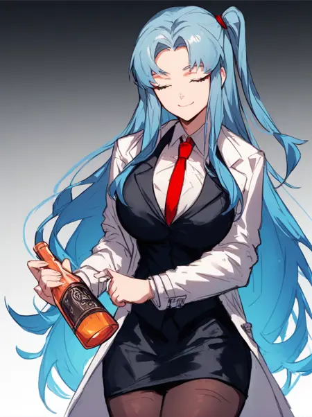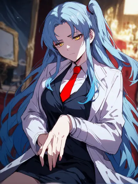AngelaPM, LC, long hair, blue hair, side ponytail, yellow eyes, red necktie, black pencil skirt, labcoat, black vest, white shirt, black pantyhose, red shoes