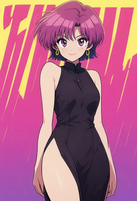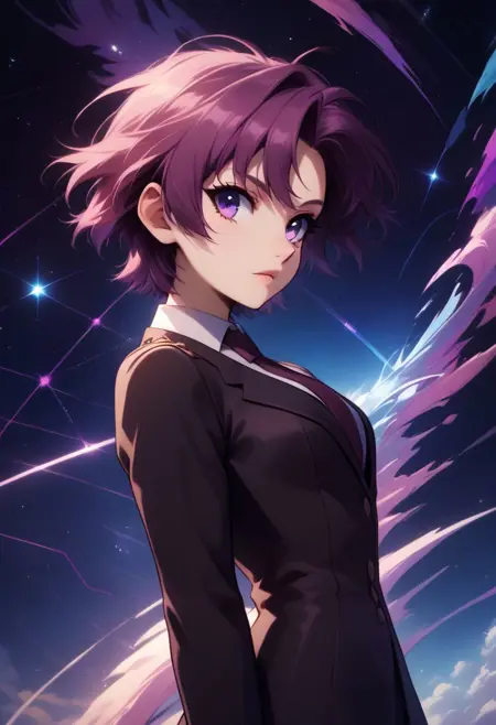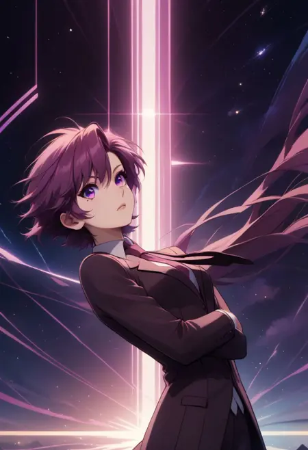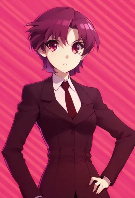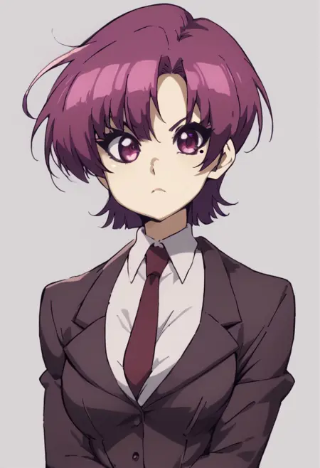zzバゼット、ショートヘア、紫目、紫髪、目の下のほくろ、ネクタイ、フォーマル、スーツ