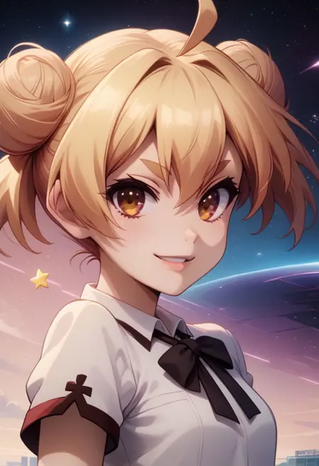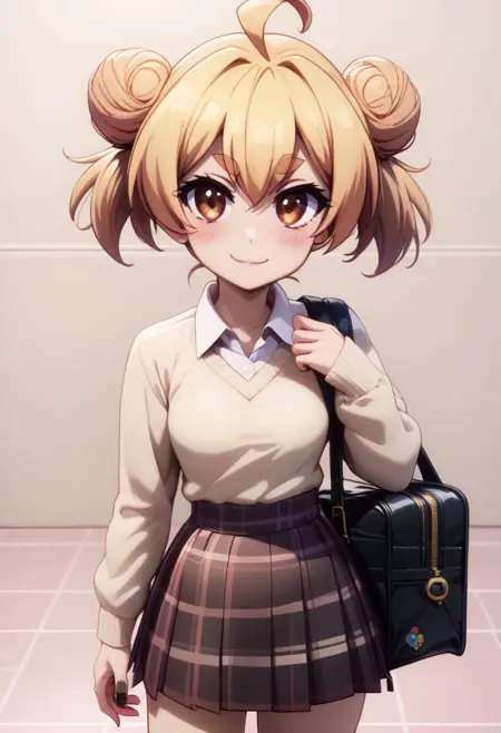 zzgakumazawatatsuko, bangs, blonde hair, hair between eyes, brown eyes, ahoge, hair bun, double bun, thick eyebrows,