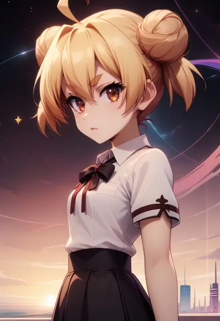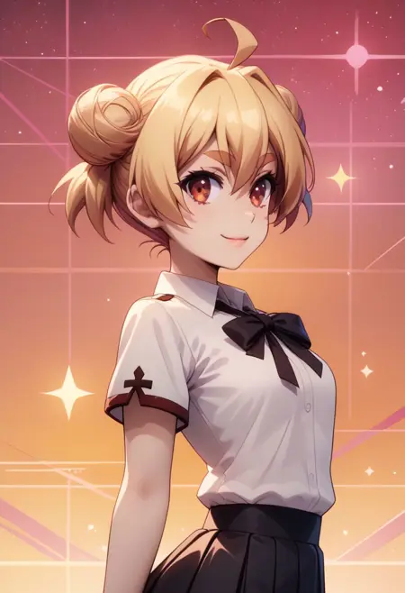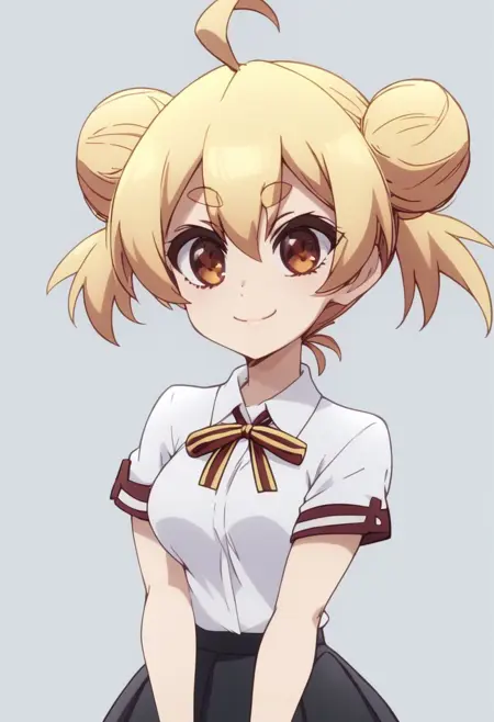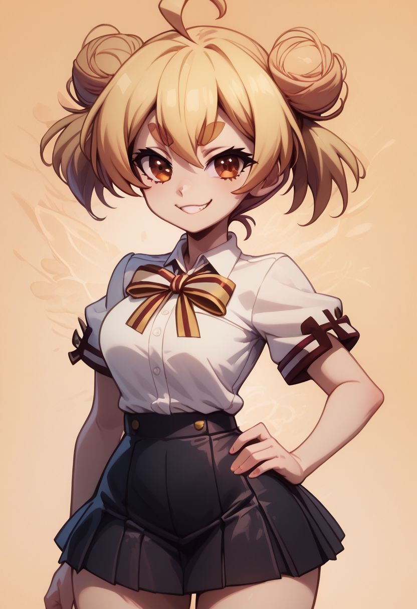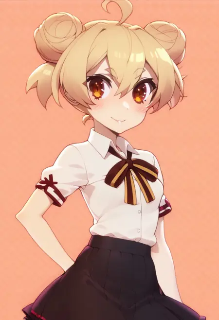 zzgakumazawatatsuko, bangs, blonde hair, hair between eyes, brown eyes, ahoge, hair bun, double bun, thick eyebrows, school uniform, neck ribbon, white shirt, collared shirt, short sleeves, black skirt,