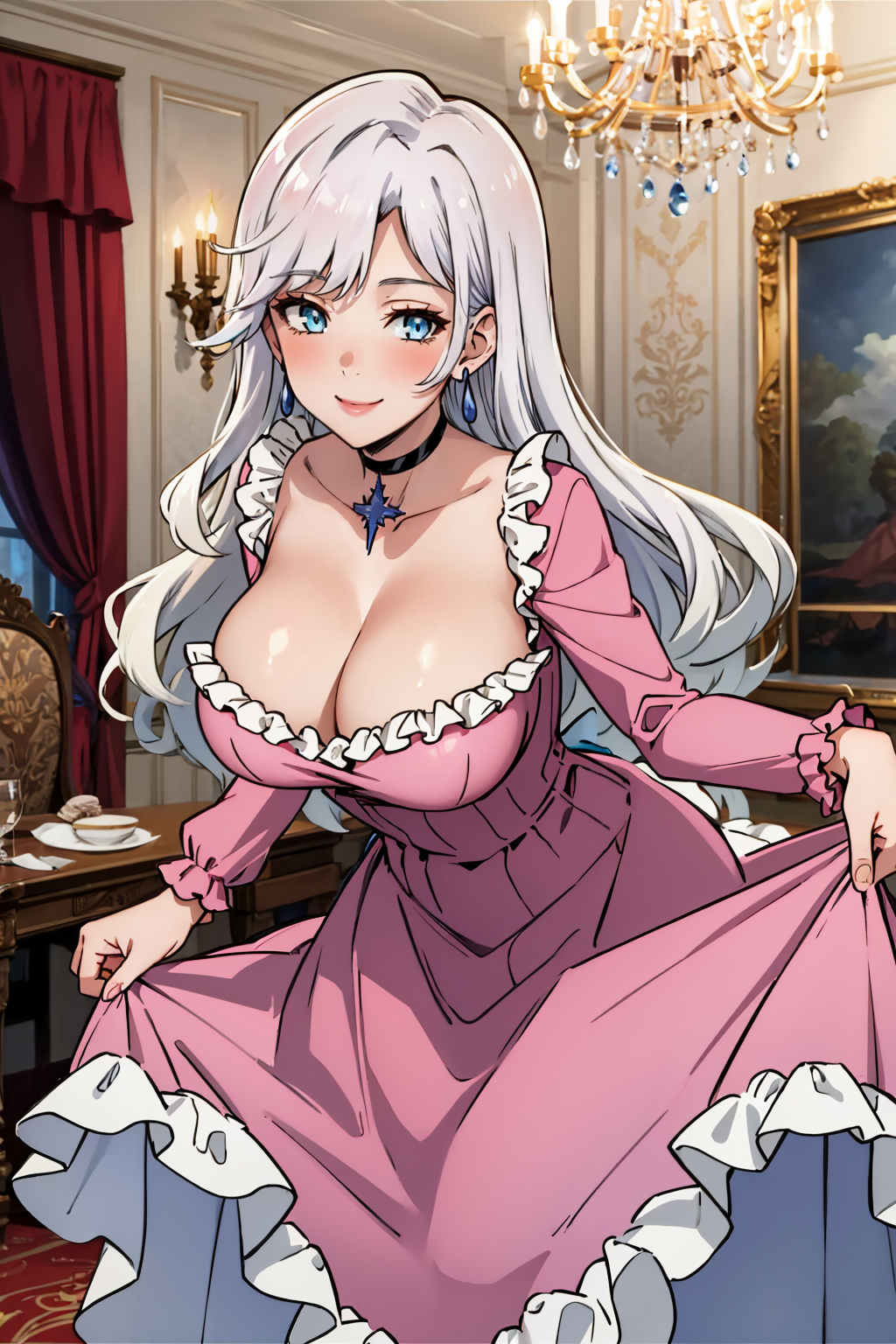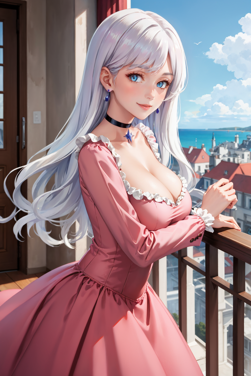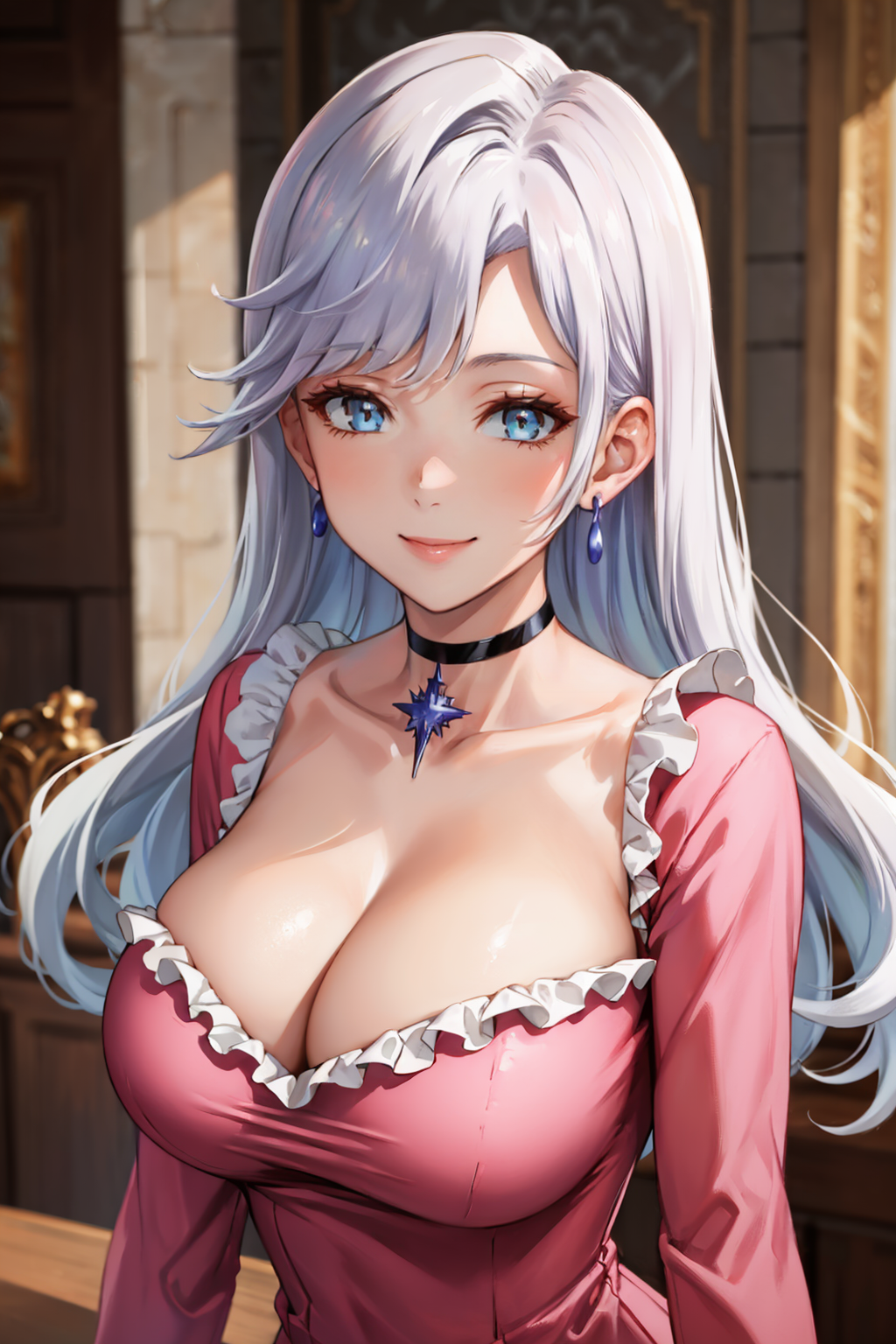 그녀의 전형적인 외모를 위해 "귀걸이, 목걸이, 분홍색 드레스, 볼가운, 가슴 노출, 프릴, 긴 소매"를 추가하세요.