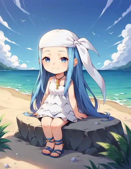 luna, blue long hair, blue eyes, white dress, necklace, key, white bandana, purple shorts, sandals,