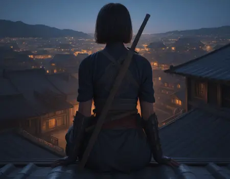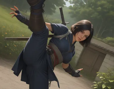 Naoe 프롬프트: 어두운 갈색, 어깨 길이, 약간 어수선한 머리를 가진 ACNaoe 여자, 진한 파란색 닌자 복장 착용
