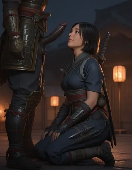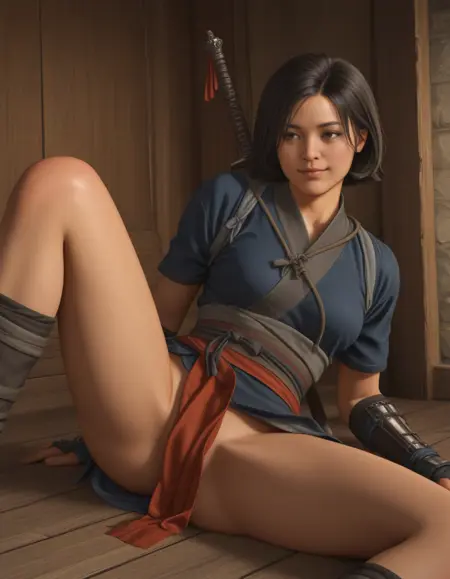 Naoe 프롬프트: 1girl, ACNaoe, 검은 머리, 단발, 갈색 눈, 가슴, 진한 파란색 닌자 복장, [빨간 끈::0.3], 등에 칼