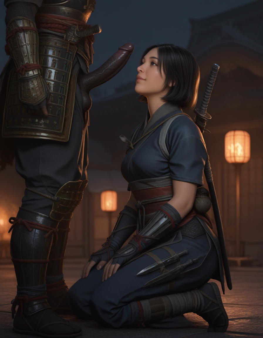 - Naoe提示词:A ACNaoe woman with dark brown, shoulder-length, and slightly messy hair wearing a dark blue ninja outfit
