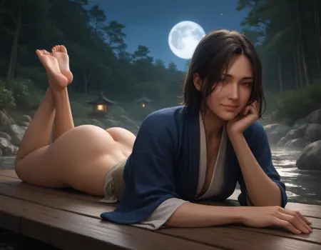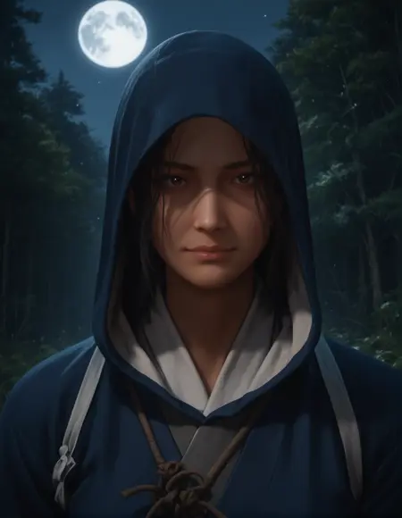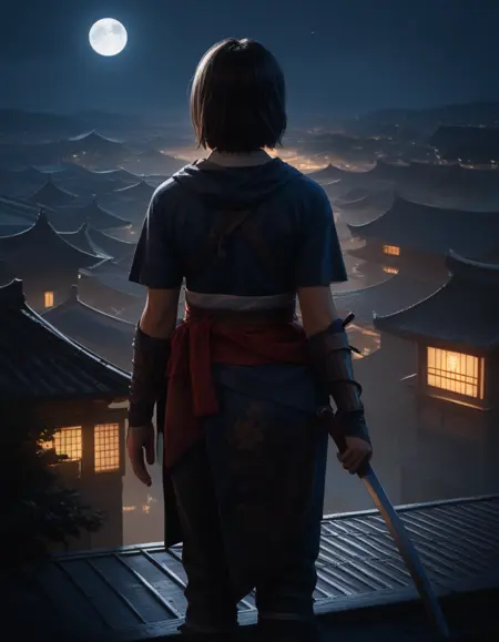 - Naoe提示词:A ACNaoe woman with dark brown, shoulder-length, and slightly messy hair wearing a dark blue ninja outfit