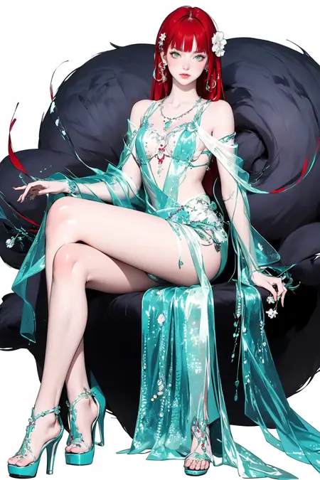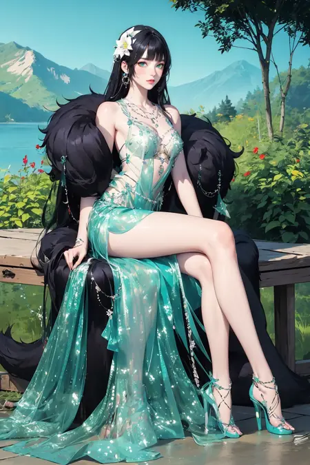 bidress-suit,bare shoulders,beads,earrings,hair flower,hair ornament,high heels,jewelry,revealing clothes,hime cut,green dress,fur coat,see-through,aqua dress,