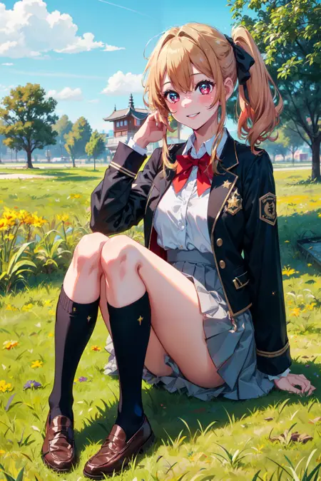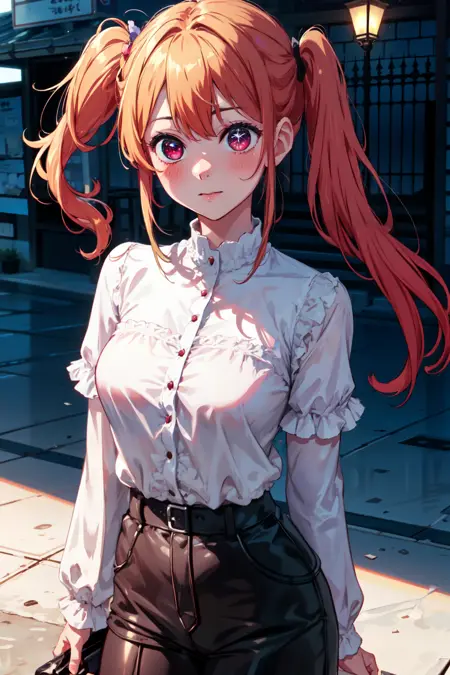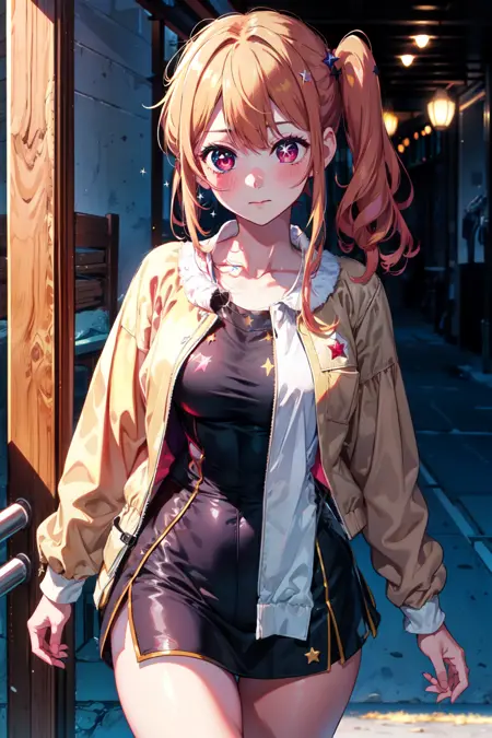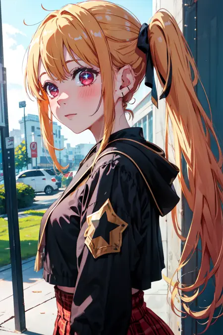 📌 提示词:星野露比,长发,金发,刘海,脸颊泛红,红瞳,符号状瞳孔,(左眼星形瞳孔:1.2),闪亮的眼睛,(左眼中的星星:1.2),眼睛中的符号,双马尾,侧马尾,发圈