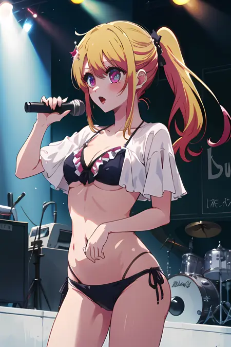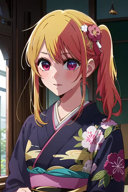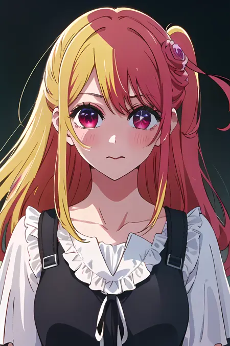 📌Prompt:Hoshino Ruby, long hair, blonde hair, bangs, blush, red eyes, symbol-shaped pupils, (left star-shaped pupils:1.2), sparkling eyes, (star in left eye:1.2), symbol in eye, twintails, side ponytail, hair band