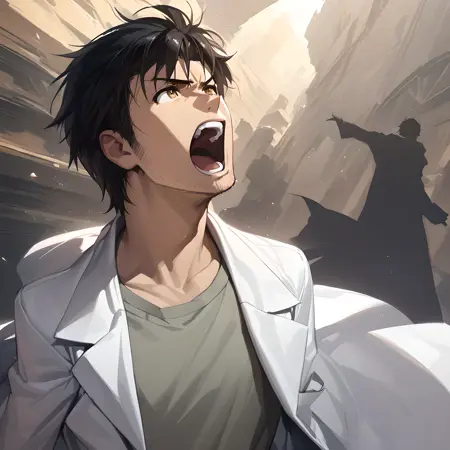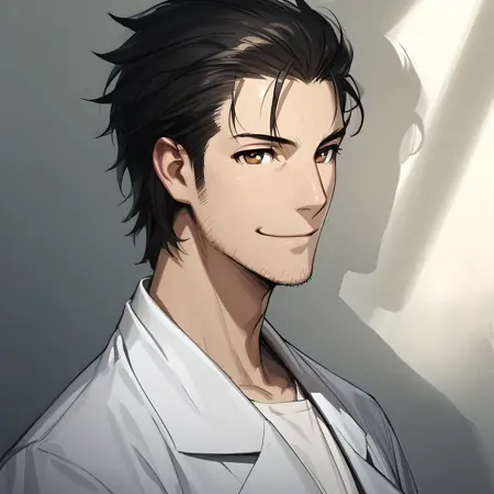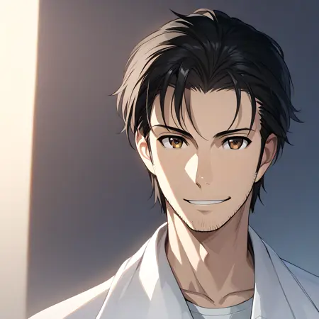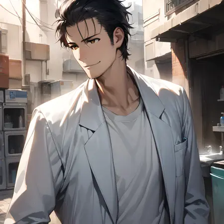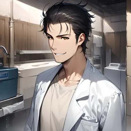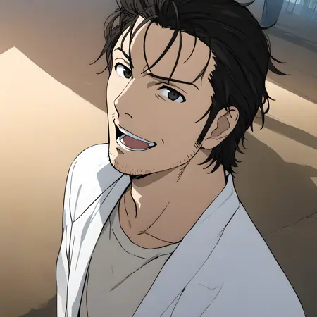 「okabe rintarou, stubble, black hair, facial hair, labcoat」を使用して活性化してください。