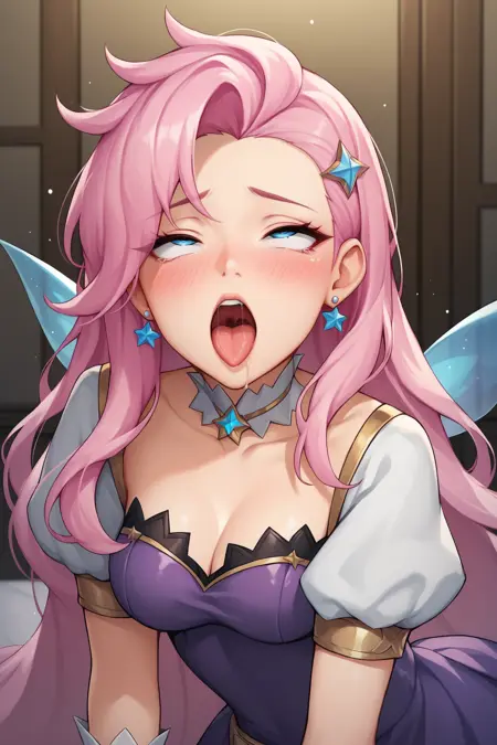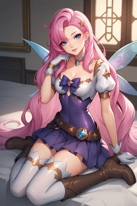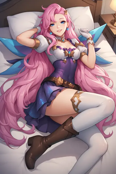 ➜ SeraphineLoLXL, 파란 눈, 분홍 머리카락, 앞머리, 머리 장식, 매우 긴 머리, 윤기 나는 머리, 별(기호), 귀걸이, 중간 크기의 가슴, 총총, 흰색 재킷, 볼륨감 있는 짧은 소매, 보라색 드레스, 날개, 흰 장갑, 치마, 벨트, 흰색 허벅지 스타킹, 갈색 부츠