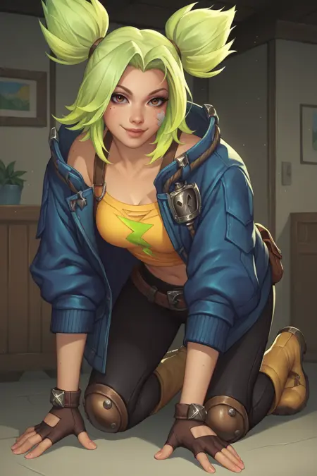 ➜ ZeriLoLXL、茶色の目、緑の髪、ツインテール、サイドロック、ほくろ、顔に絆創膏、中程度の胸、青いジャケット、開いたジャケット、黄色い腹出し、手袋、指なし手袋、黒いズボン、ベルト、膝当て、ブーツ