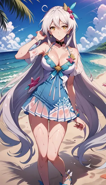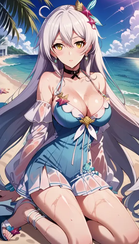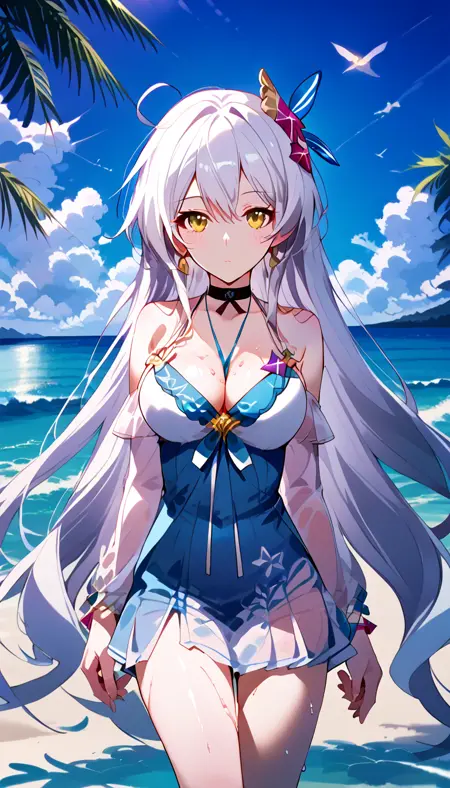 1girl,long hair,solo,bangs,kiana kaslana,white hair,hair ornament,yellow eyes,bare shoulders,hair between eyes,dress,jewelry,breasts,earrings,very long hair,choker,ahoge,sundress,shell hair ornament antenna hair,blue dress,sandals