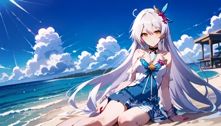 | Trained Words | 1girl,long hair,solo,bangs,kiana kaslana,white hair,hair ornament,yellow eyes,bare shoulders,hair between eyes,dress,jewelry,breasts,earrings,very long hair,choker,ahoge,sundress,shell hair ornament antenna hair,blue dress,sandalsCopied! |